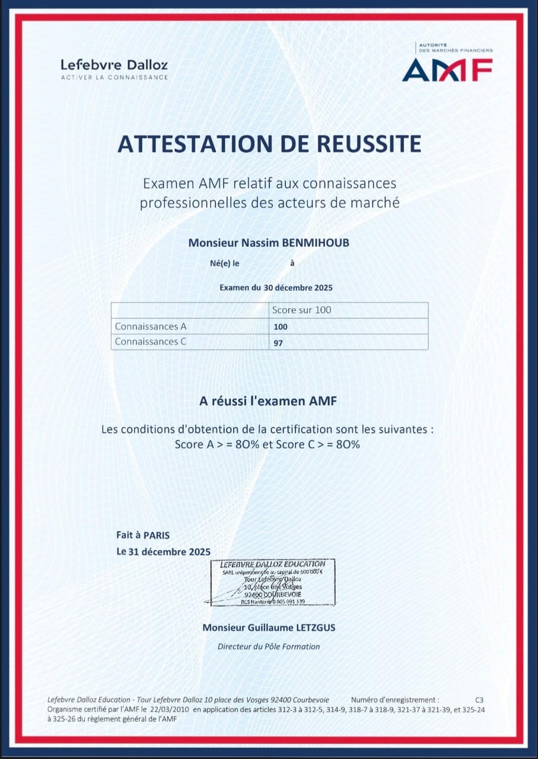 Validation officielle des connaissances relatives au cadre légal et réglementaire des marchés financiers, conformément aux standards exigés par l’AMF.
